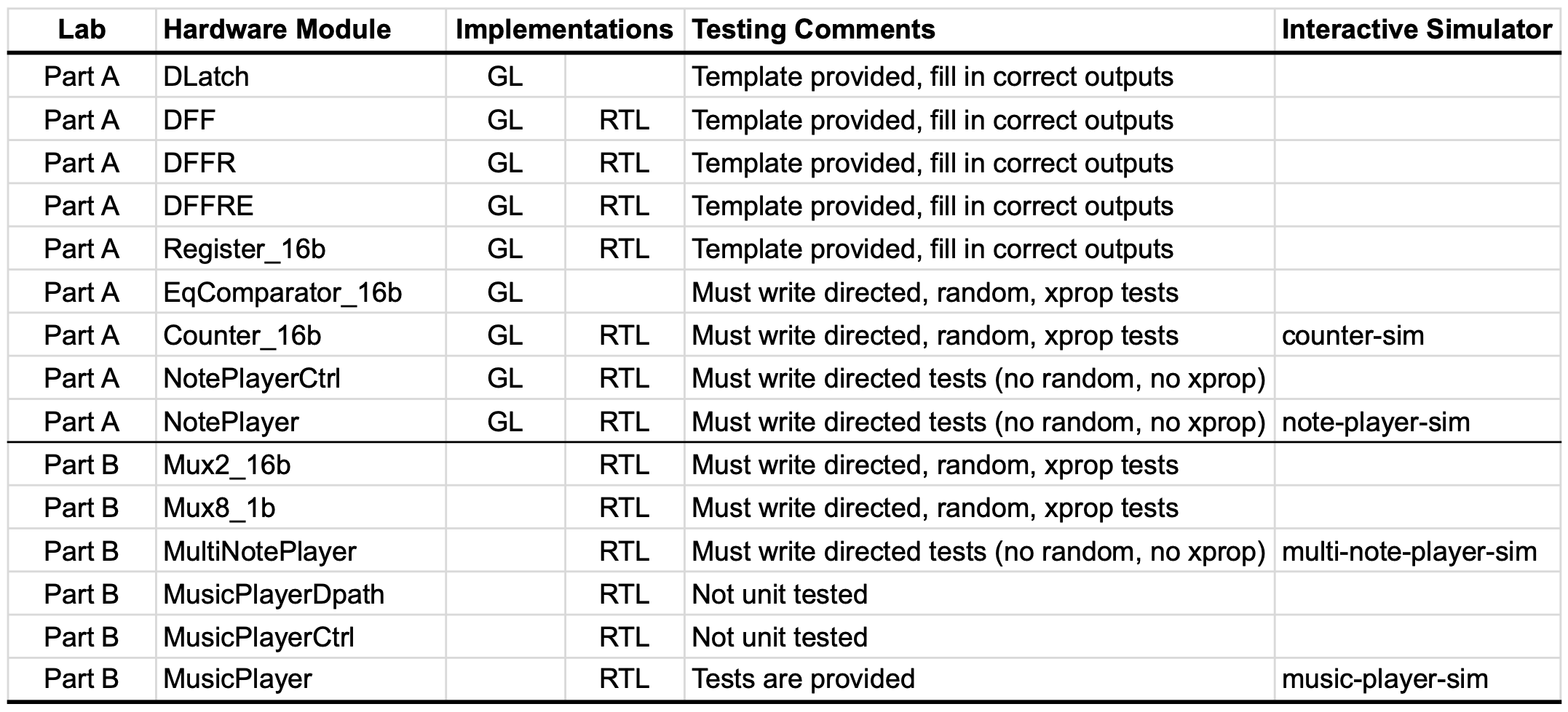 The following table shows all of the hardware modules you will be developing in Lab 3.