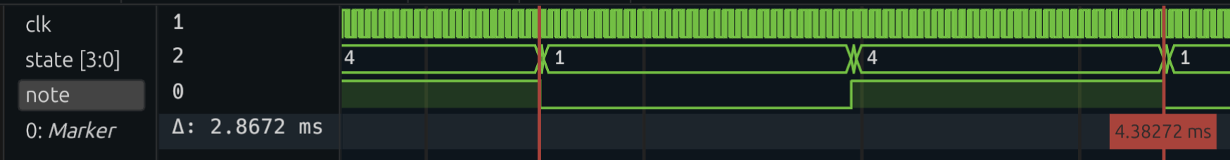 The simulator will generate a VCD file that you can then open using Surfer to look at the note output waveform. You can measure period between rising edges of the note output to verify that the note player is indeed generating the note at the proper frequency. For example, this is what the output looks like when setting the switches to 0100_0100. The period is 2.86ms which is 348Hz or the note F4. Try other notes!