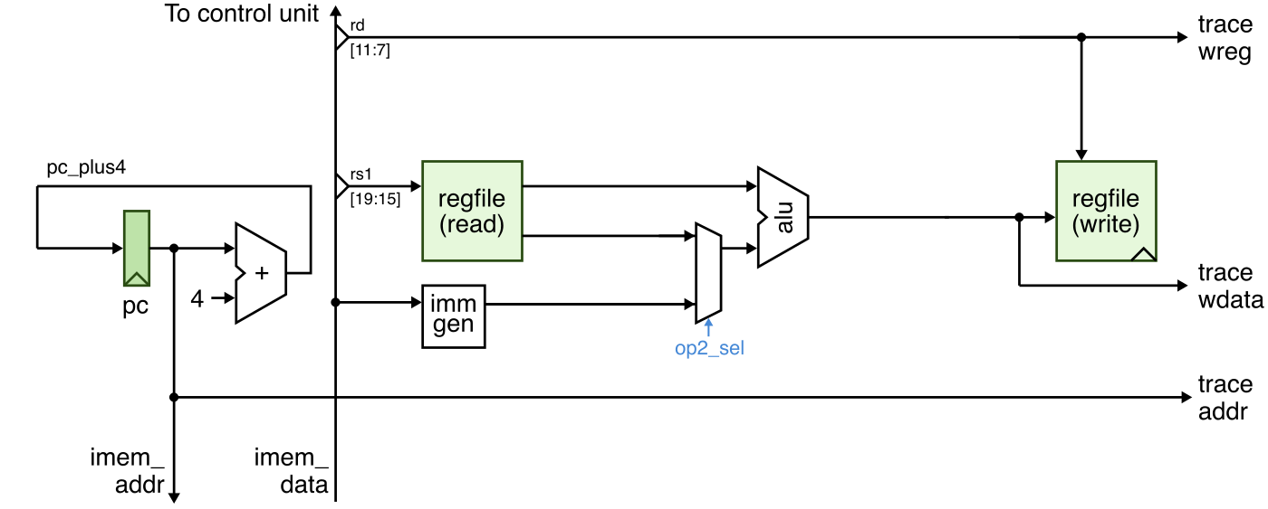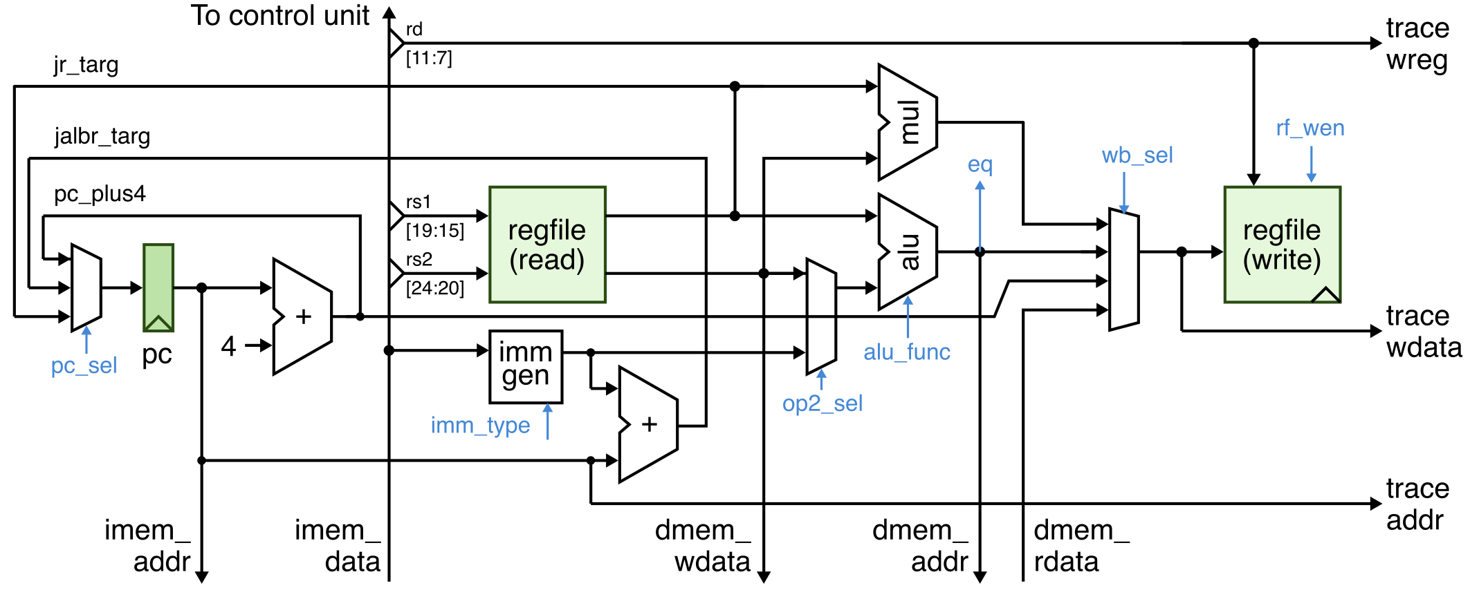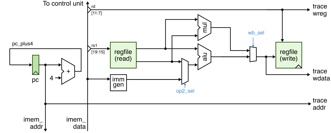 The trace interface is used for verification and should produce a "trace" of all instructions executed by the processor. This interface was not discussed in lecture, but is an important practical aspect of implementing a real processor. We need a simple way to check that each instruction has executed correctly.