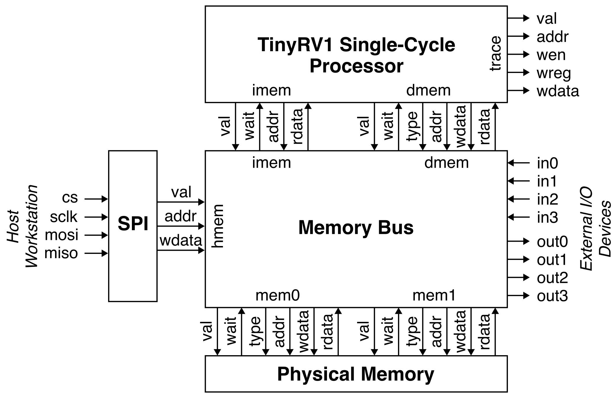 A complete TinyRV1 embedded system includes the following key components: (1) the TinyRV1 processor itself; (2) 512 bytes of physical memory for storing instructions and data; (3) an SPI unit to enable a host workstation to load assembly programs into physical memory; (4) various external I/O devices (e.g., switches, sevent-segment displays, distance sensor, multi-note player); and (5) a memory bus which interconnects the processor, physical memory, SPI, and external I/O devices.